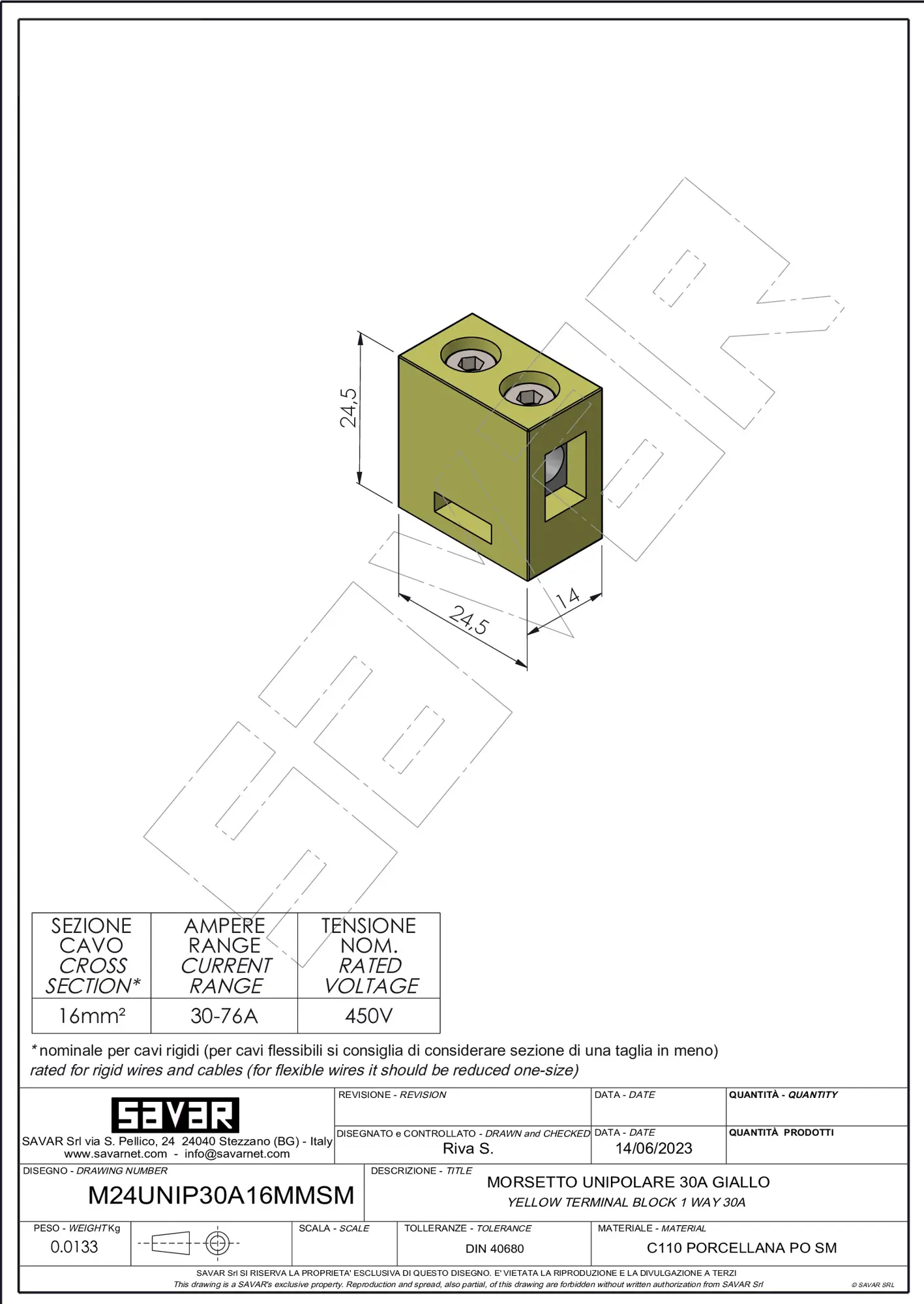 Einpoliger Erdungsklemmenblock aus technischer Keramik, verglissert gelb zur sofortigen Identifikation, für die Verbindung von elektrischen Kabeln in zivilen und industriellen Verteilsystemen. Diese Klemme wird dank der hervorragenden thermischen Widerstandseigenschaften des Keramikkörpers in Maschinen wie Elektroöfen, elektrischen Heizgeräten und Geräten eingesetzt, bei denen eine hohe Temperaturbeständigkeit erforderlich ist.