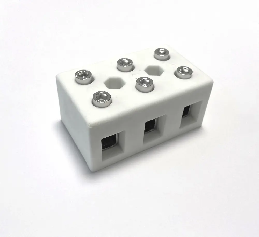 Dreipoliger Klemmenblock aus technischer Keramik für die Verbindung von elektrischen Kabeln in zivilen und industriellen Verteilungssystemen. Dank der hervorragenden thermischen Beständigkeit durch Keramik wird diese Klemme in den elektrischen Systemen von Straßentunneln, Zug- und U-Bahn-Tunneln sowie für Teile von Booten verwendet, die feuerresistent sein müssen. Es wird auch in Maschinen wie Elektroöfen, elektrischen Heizungen und Geräten eingesetzt, bei denen eine hohe Temperaturbeständigkeit erforderlich ist.