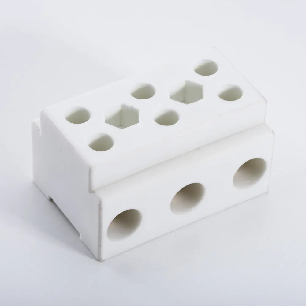 Terminalblöcke dreifach (Masten) aus technischem keramischem Steatit. Beeindruckende Eigenschaften und die Beständigkeit gegenüber hohen Temperaturen von Keramik ermöglichen es, diese Art von Klemmenblöcken in Kabeln auf elektrischen Geräten sowohl für Industrie- als auch für Privatanwender anzuwenden. In der Industrie werden sie in extrem hohen Temperaturanwendungen wie Öfen, Heizungen, Prozessgeräten und Maschinen eingesetzt. Extra großes Maß für Kabel bis 25 mmq.