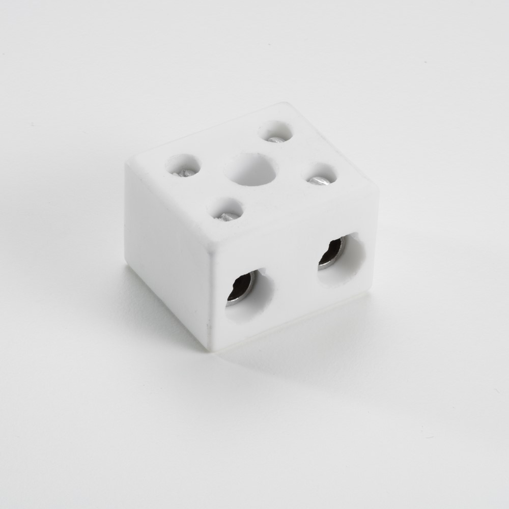 Terminal blocks two ways (poles) in technical ceramic. Impressive properties and resistance to high temperatures of ceramic enable to apply this type of terminal blocks in cables on electrical devices for both industry as well as domestic users. In the industry field are used in extremely high temperature applications such as furnaces, heaters, process equipment and machinery.