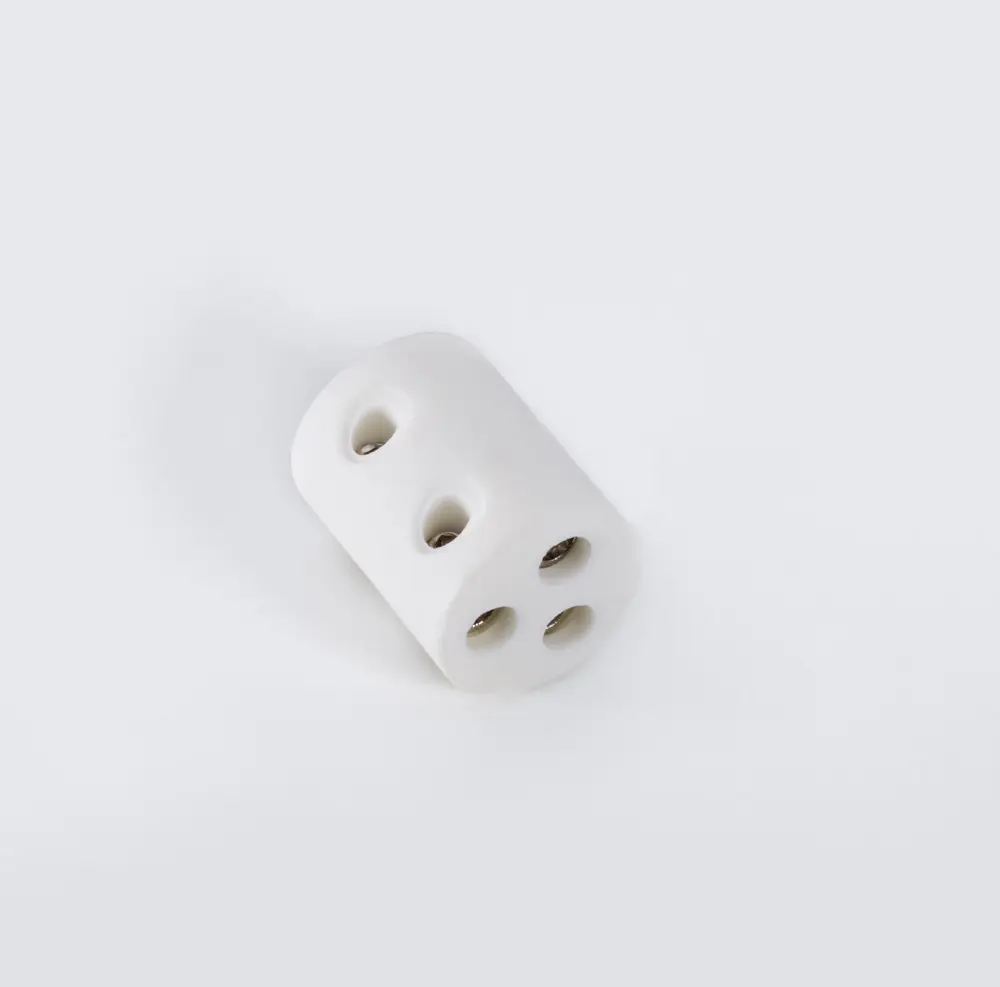 Bloques terminales de tres polos (pinos) en cerámica de esteatita. En el sector industrial se utilizan en aplicaciones a temperaturas extremadamente altas como hornos, calefactores, termopares y termorresistencias.