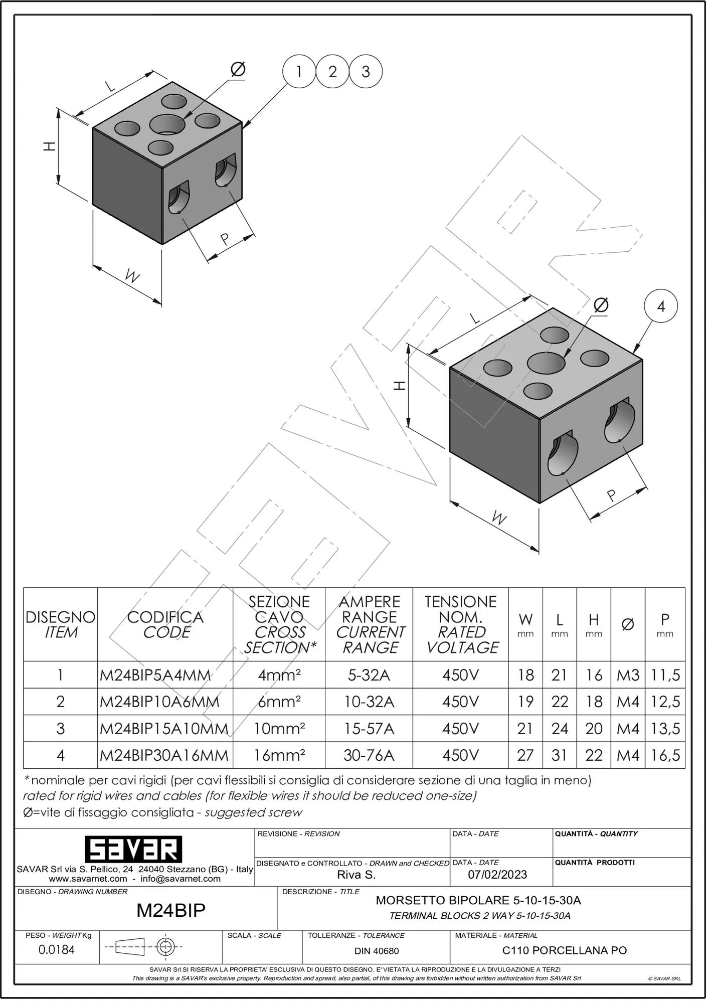 Bloque de terminales bipolares en cerámica técnica, para la conexión de cables eléctricos en sistemas de distribución civiles e industriales. Esta abrazadera, gracias a las excelentes propiedades de resistencia térmica que confiere el cuerpo cerámico, se utiliza en maquinaria como hornos eléctricos, calefactores eléctricos y equipos donde se requiere alta resistencia a temperaturas.