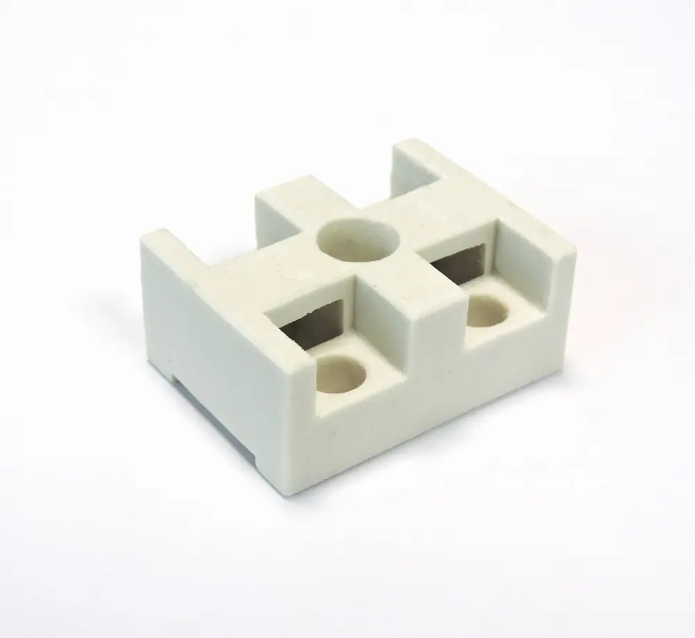 Bloc terminal bipolaire en céramique technique sans contacts, pour la connexion des câbles électriques dans les réseaux de distribution civils et industriels. Ces bornes, grâce à leurs excellentes propriétés de résistance thermique conférées par la céramique, sont utilisées dans des machines telles que les fours électriques, les chauffages électriques et les équipements nécessitant une très haute résistance à la température.
