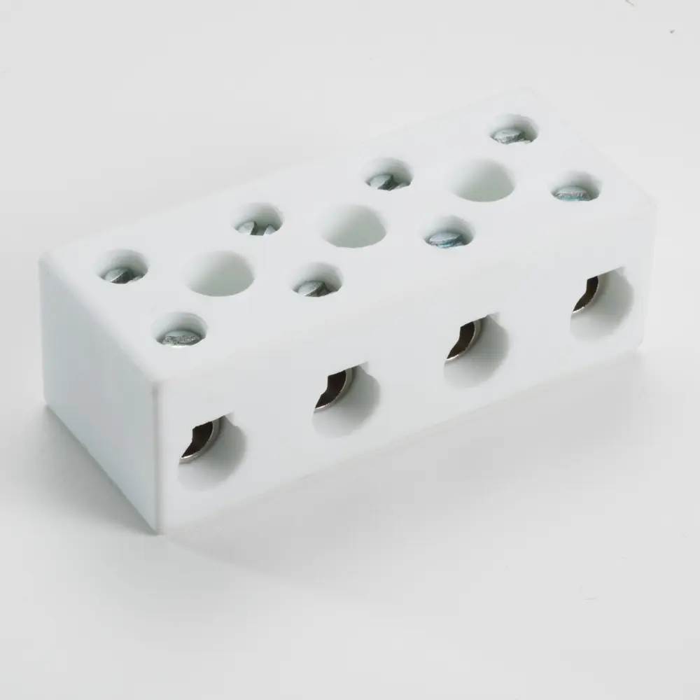 Bloc terminal à quatre conducteurs en céramique technique, pour la connexion des câbles électriques dans les réseaux de distribution civils et industriels. Cette pince, grâce à l’excellente résistance thermique conférée par le corps céramique, est utilisée dans des machines telles que les fours électriques, les chauffages électriques et les équipements nécessitant une haute résistance à haute température.