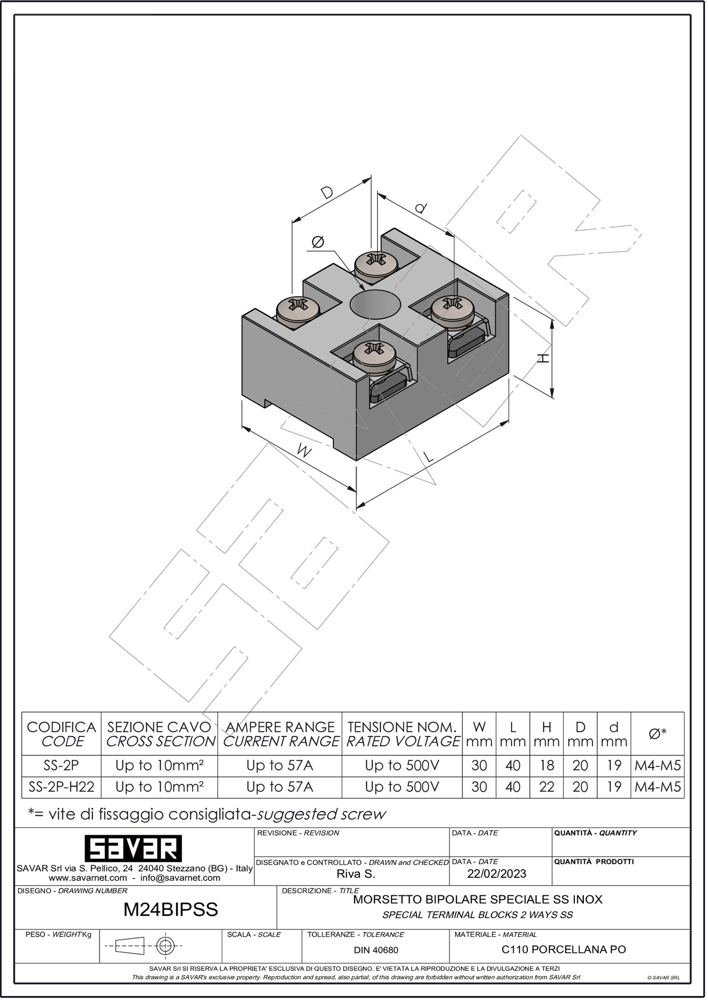 Morsettiera bipolare in ceramica tecnica, per la connessione di cavi elettrici in impianti di distribuzione civili ed industriali. Questi morsetti grazie alle ottime proprietà di resistenza termica conferite dalla ceramica ed agli inserti in acciaio inossidabile trovano applicazione in macchinari quali forni elettrici, resistenze elettriche e apparecchiature ove si necessita un'altissima resistenza alla temperatura. Inserti, viti e minuteria sono in AISI 304.