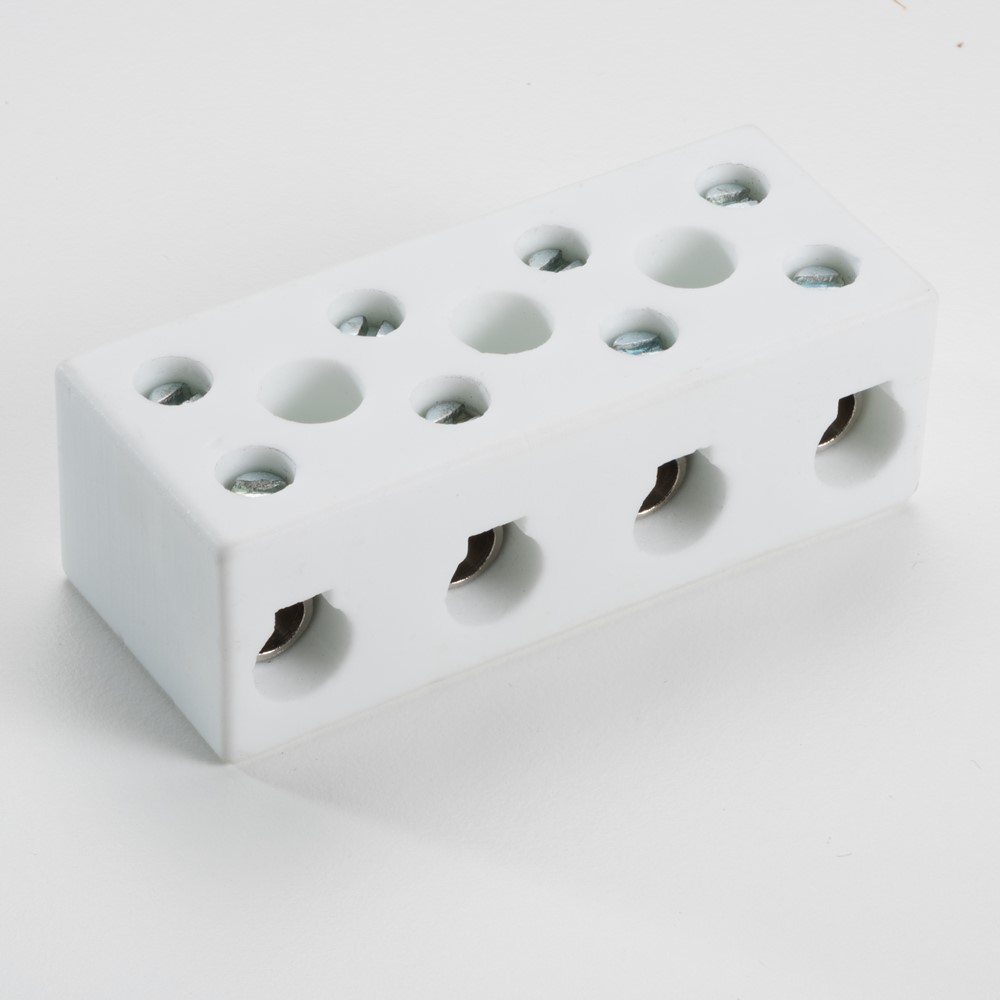 Morsettiera quadripolare in ceramica tecnica, per la connessione di cavi elettrici in impianti di distribuzione civili ed industriali. Questo morsetto grazie alle ottime proprietà di resistenza termica conferite dal corpo in ceramica trova applicazione in macchinari quali forni elettrici, resistenze elettriche e apparecchiature ove si necessita un'elevata resistenza alla temperatura.