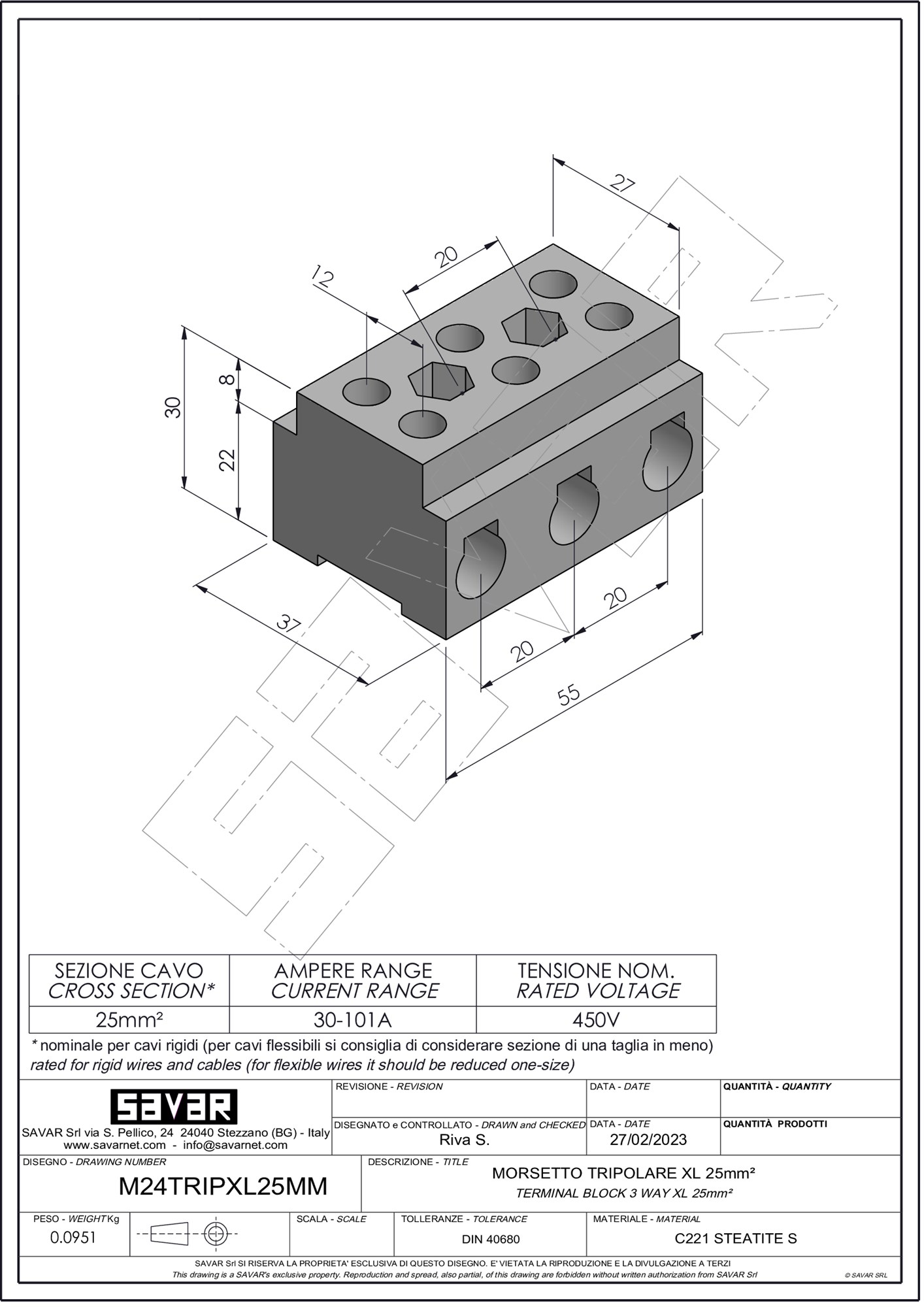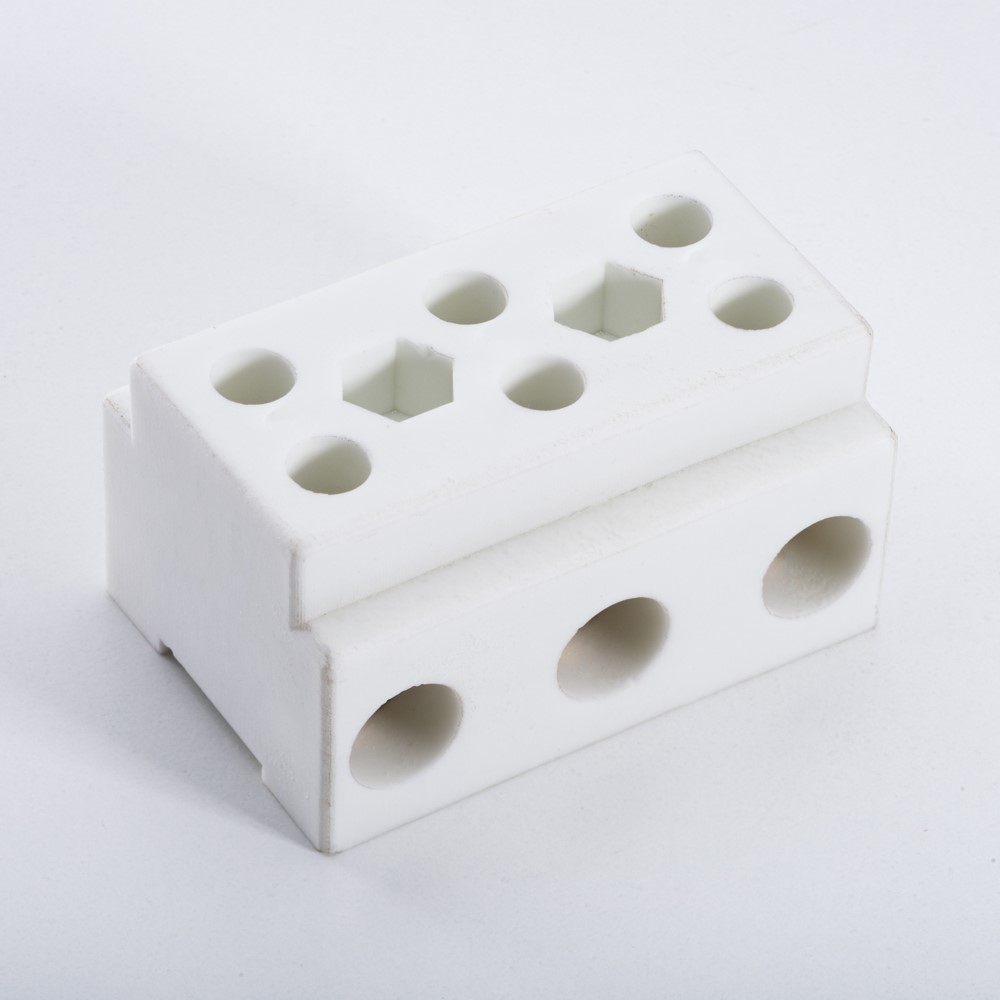 Morsettiera tripolare in ceramica tecnica, per la connessione di cavi elettrici in impianti di distribuzione civili ed industriali. Questo morsetto grazie alle ottime proprietà di resistenza termica conferite dal corpo in ceramica trova applicazione in macchinari quali forni elettrici, resistenze elettriche e apparecchiature ove si necessita un'elevata resistenza alla temperatura. Misura extra-large per cavo fino a sezione 25 mmq.
