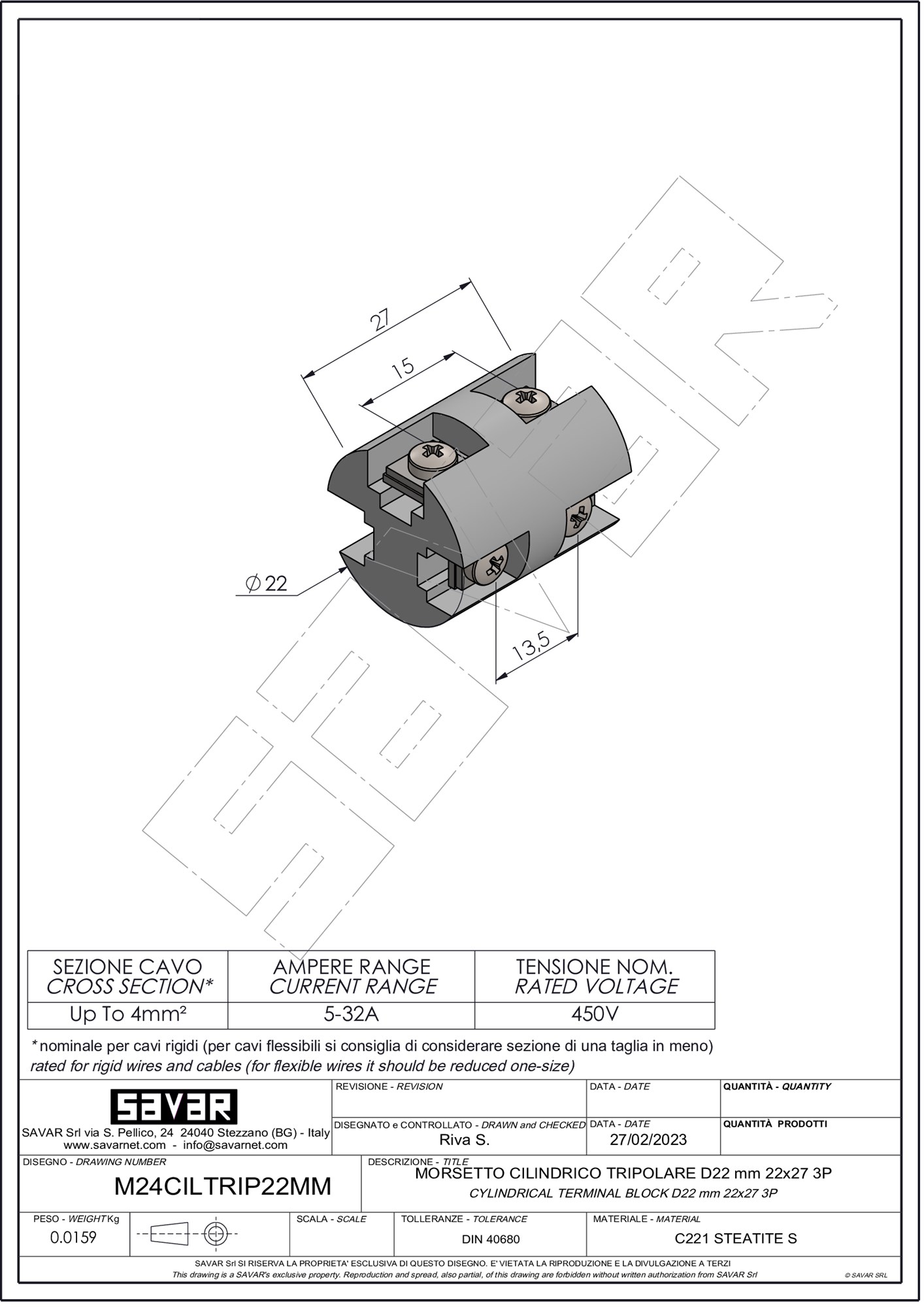 Morsettiere tripolari in Steatite, per la connessione di cavi elettrici in impianti di distribuzione civili ed industriali. Questi morsetti grazie alla forma cilindrica ed alle ottime proprietà di resistenza termica conferite dalla ceramica trovano applicazione soprattutto in termoresistenze, termocoppie, resistenze elettriche e apparecchiature ove si necessita un'elevata resistenza alla temperatura.