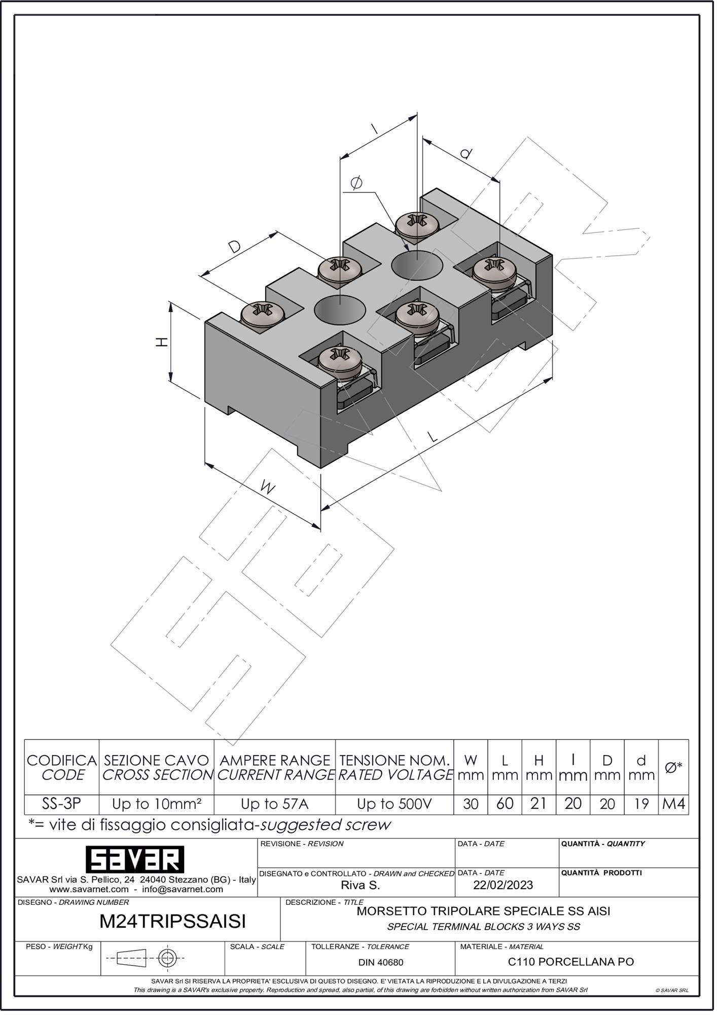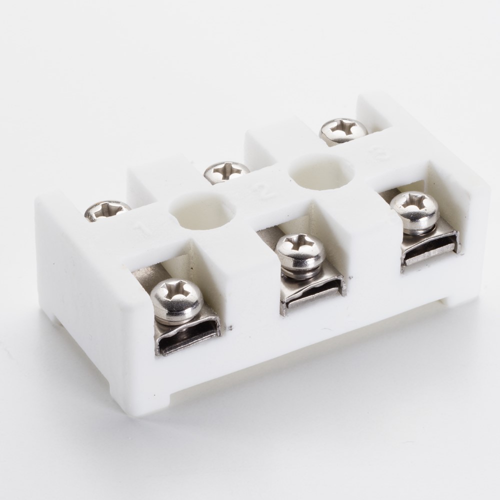 Morsettiera tripolare in ceramica tecnica, per la connessione di cavi elettrici in impianti di distribuzione civili ed industriali. Questi morsetti grazie alle ottime proprietà di resistenza termica conferite dalla ceramica ed agli inserti in acciaio inossidabile trovano applicazione in macchinari quali forni elettrici, resistenze elettriche e apparecchiature ove si necessita un'altissima resistenza alla temperatura. Inserti, viti e minuteria sono in AISI 304.