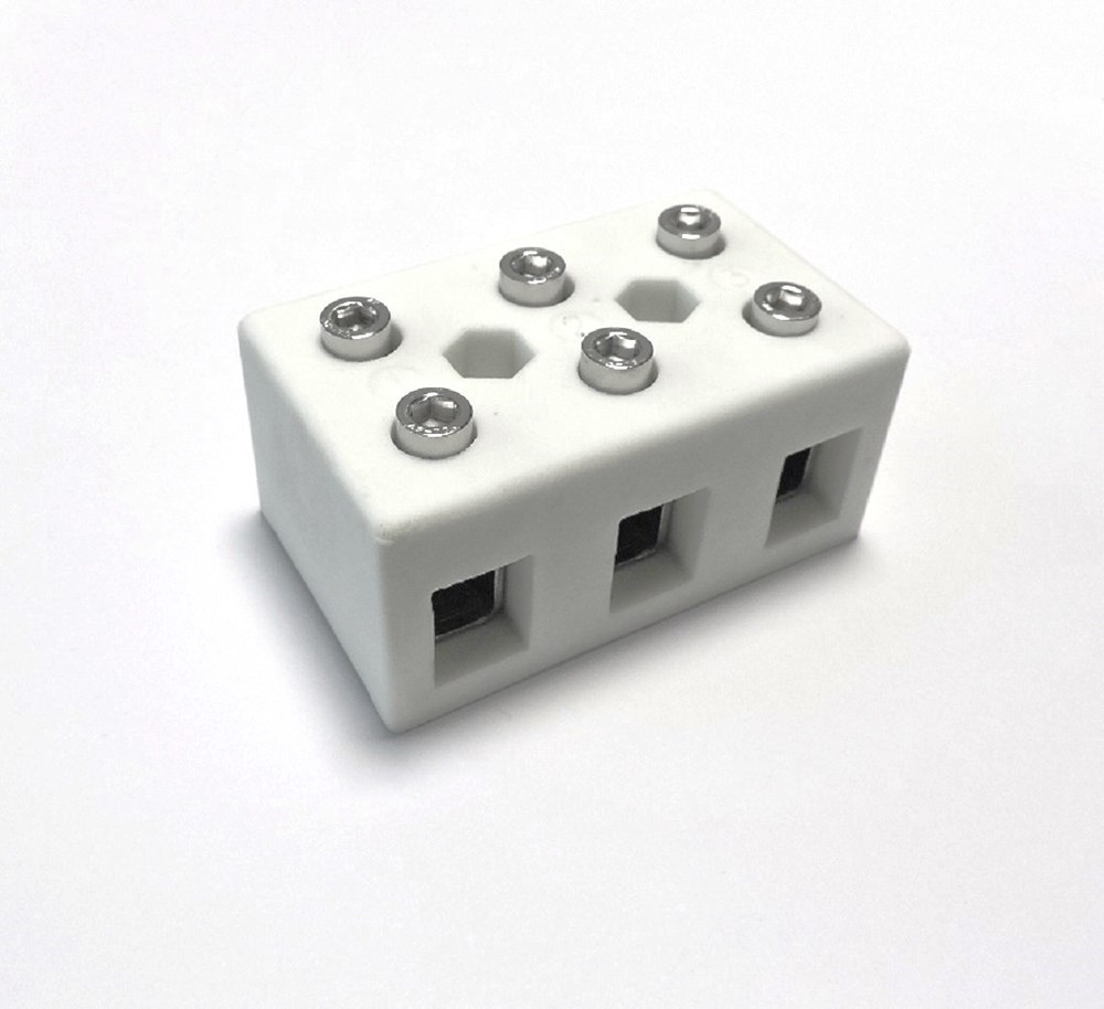 Morsetto tripolare in ceramica tecnica, per la connessione di cavi elettrici in impianti di distribuzione civili ed industriali. Questo morsetto grazie alle ottime proprietà di resistenza termica conferite dalla ceramica trovano applicazione negli impianti elettrici di gallerie stradali, gallerie di treni e metropolitane e per le parti di imbarcazioni che devono resistere al fuoco. Trova inoltre applicazione in macchinari quali forni elettrici, resistenze elettriche e apparecchiature ove si necessita un'elevata resistenza alla temperatura.